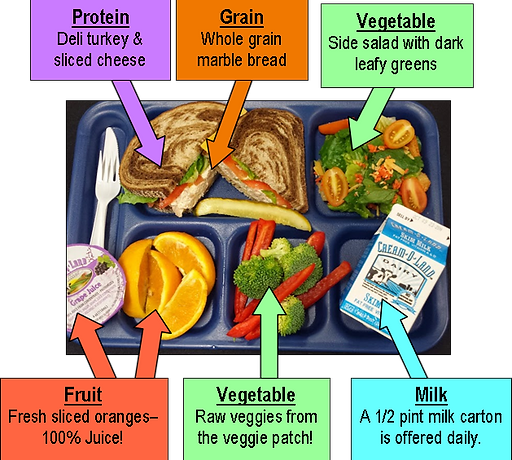 5 components of a healthy lunch. Portion sizes are based on age group being served.